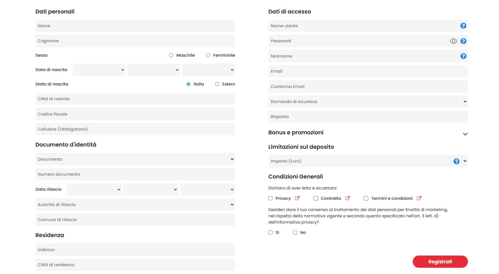 Inserisci nome, cognome, data e luogo di nascita, residenza, recapiti e dati del documento d’identità. Questa fase è obbligatoria per rispettare le disposizioni ADM sul gioco a distanza.